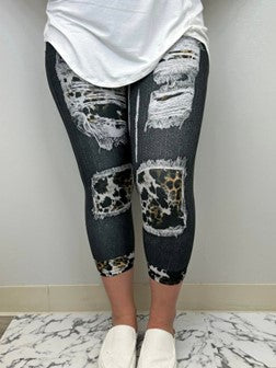 Black Denim-Look Capri Leggings with Leopard Patch - #4233-42356