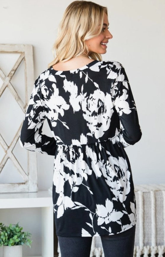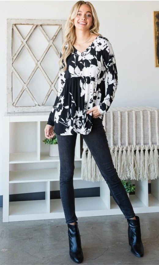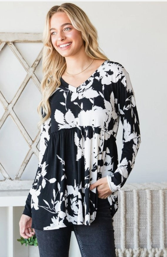 LONG SLEEVE V NECK FLORAL PRINT BABYDOLL TOP WITH SHIRRING AND RUFFLED DETAIL