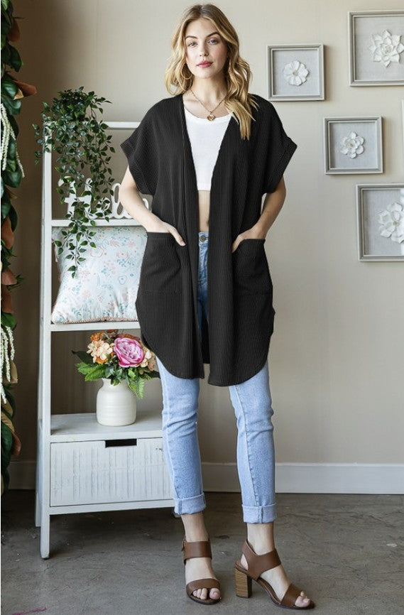 DOLMAN SHORT SLEEVE RIBBED OPEN CARDIGAN WITH SIDE POCKET AND ROUND HEM DETAIL