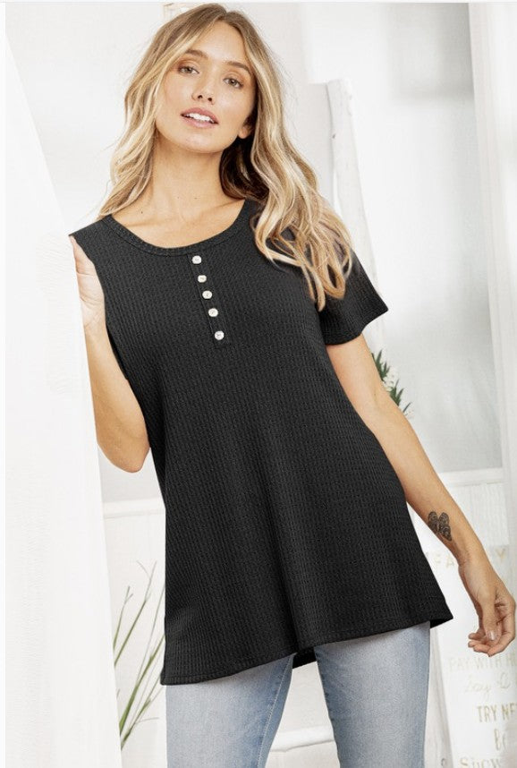- - SHORT SLEEVE ROUND NECK WAFFLE SOLID TOP WITH FRONT BUTTON DETAIL