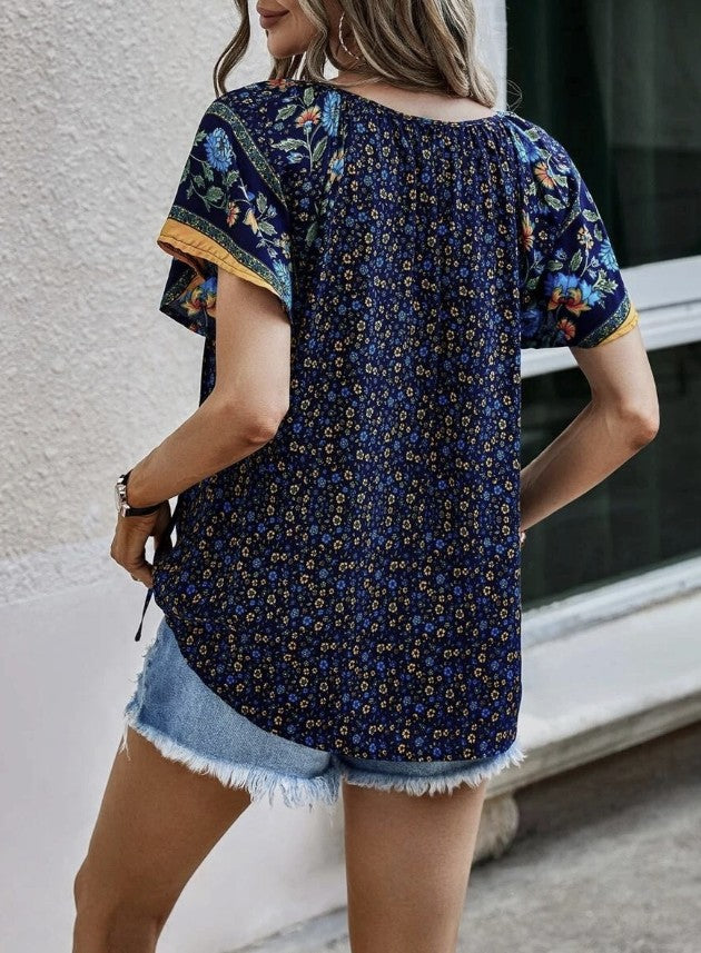 CLAN STYLE PRINTED VNECK SHORT-SLEEVED LOOSE SHIRT