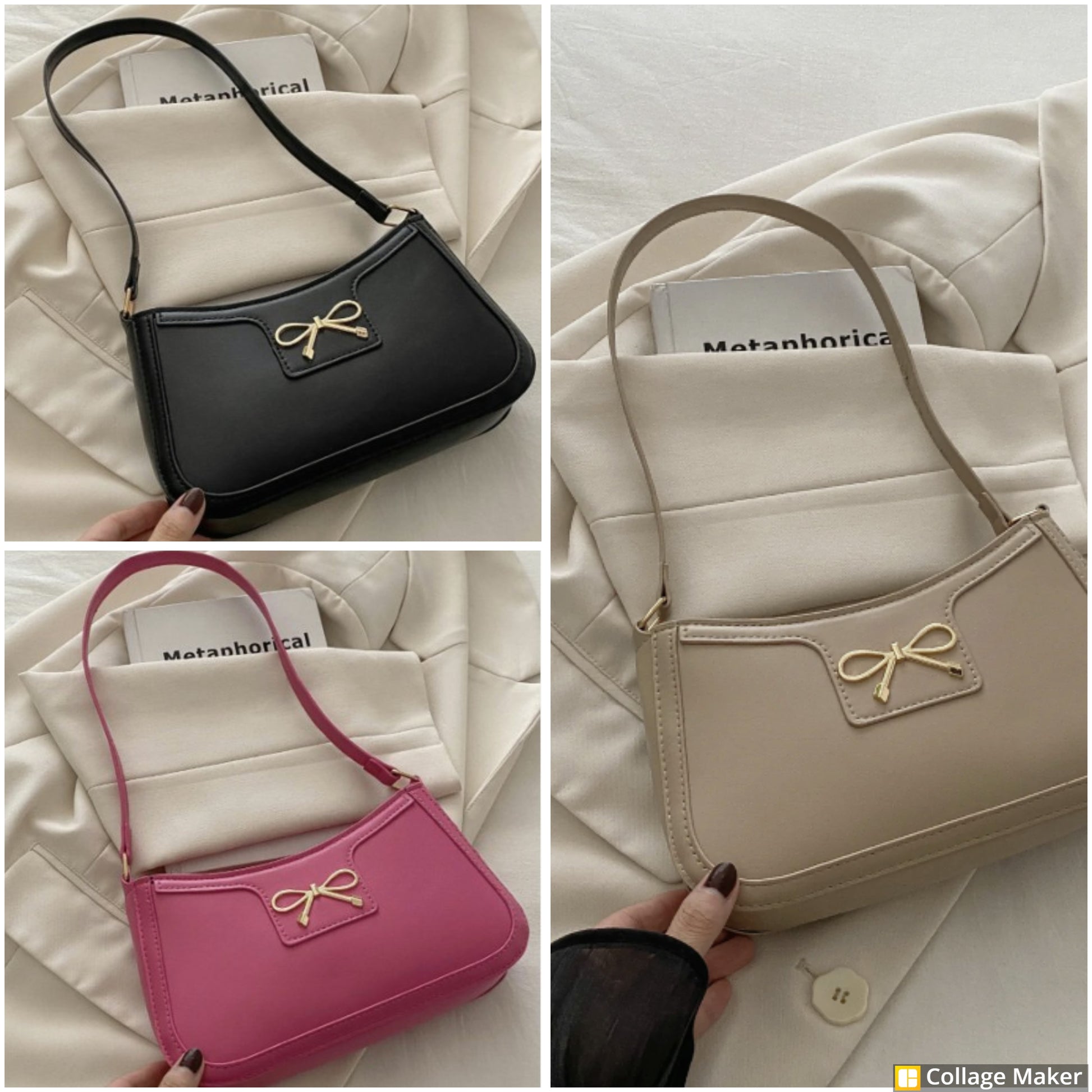 Bow Trimmed Shoulder Bag (Khaki-Black-Hot Pink) - #9293-9295