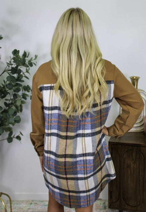 The Brown Flannel Dress effortlessly combines style and functionality with its plaid patchwork and two large chest pockets. Perfect for any occasion, it pairs well with boots or can be layered over a shirt and jeans or leggings. Upgrade your wardrobe with this versatile dress.