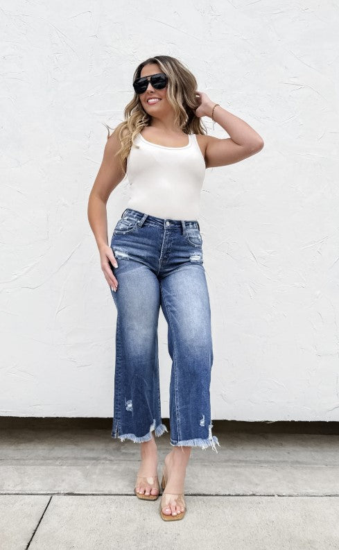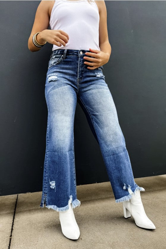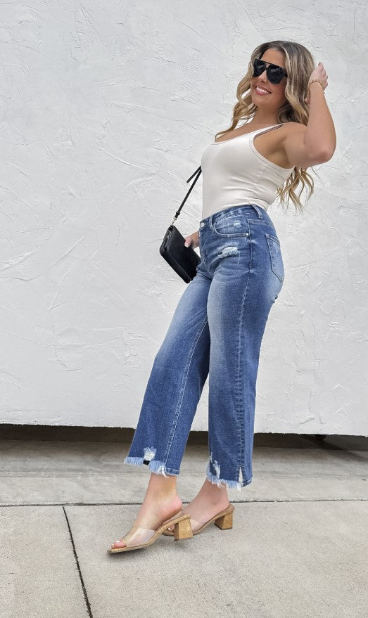 The perfect crop, wide leg denim! Very stretchy and mildly distressed on legs with bottom hem distressed and small side slit.