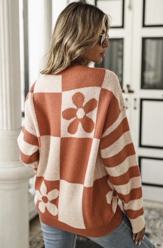 š¼ Stay trendy and cozy in this Checkered Floral Print Striped Sleeve Sweater!