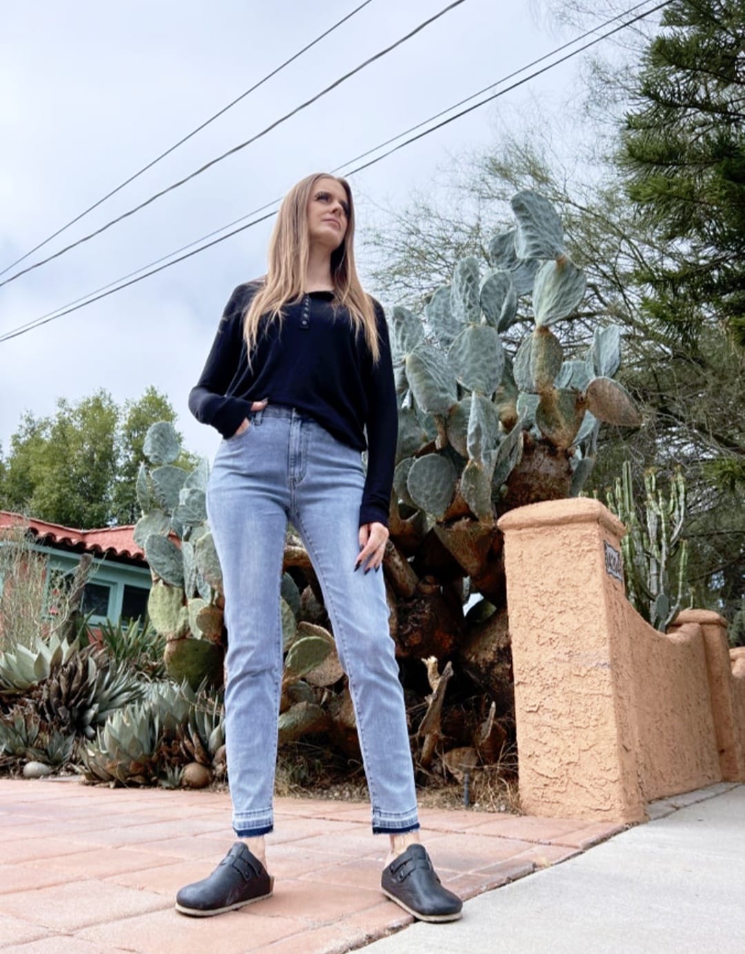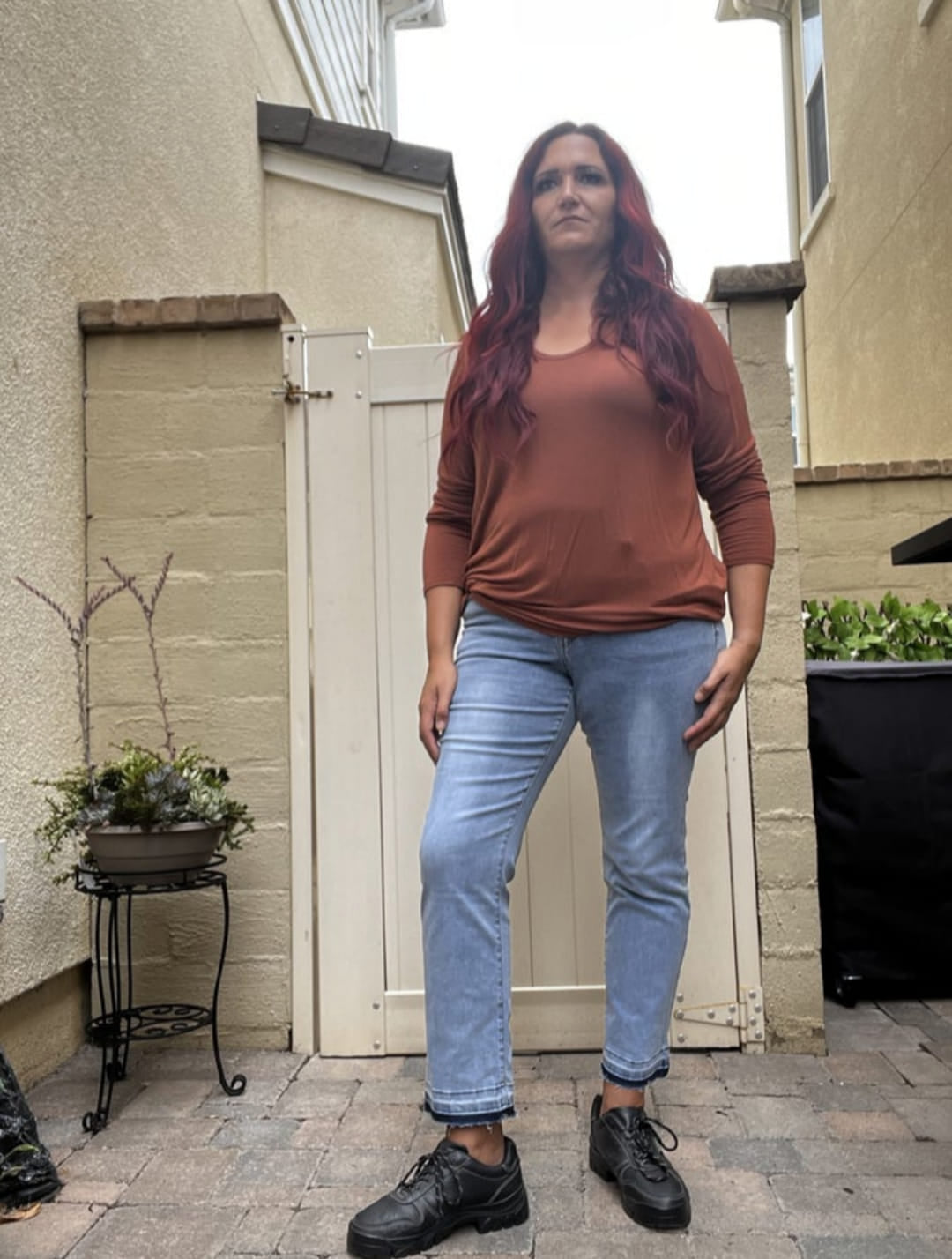 Make your day comfortable with this relaxed skinny that won't dislocate your knee cap when you sit down! This high rise fit and looser leg will have you wondering if you are in denim or your favorite pair of sweats!