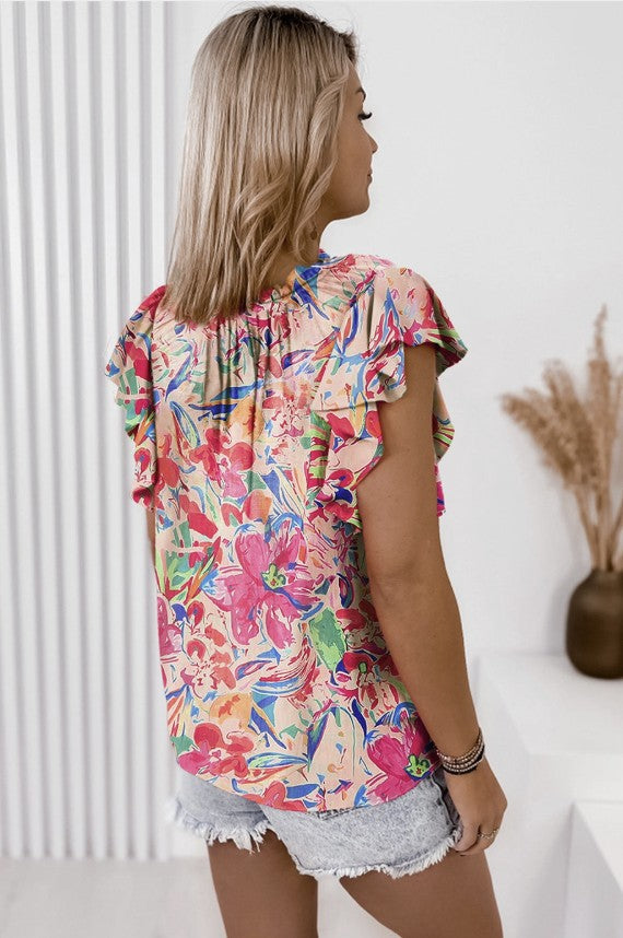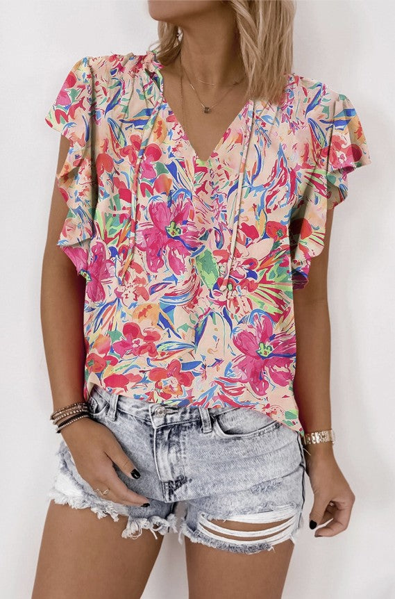 Multicolor Floral V-neck Top w/Ruffle Sleeves