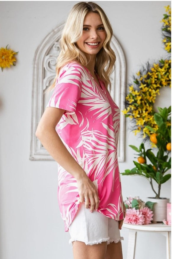 SHORT SLEEVE V NECK TROPICAL PRINT TOP