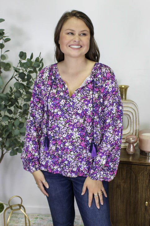 Upgrade your wardrobe with our exclusive Purple Floral Blouse. This stylish top features a flattering v neck design and adorable tassels at the neckline for a touch of elegance. The bubble sleeves add a trendy touch, making it the perfect addition to any outfit. Upgrade your style game now.