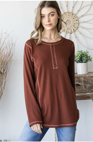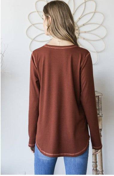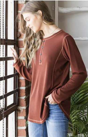 - - LONG SLEEVE ROUND NECK SOLID RIBBED TOP WITH FRONT BUTTON AND STITCH DETAIL