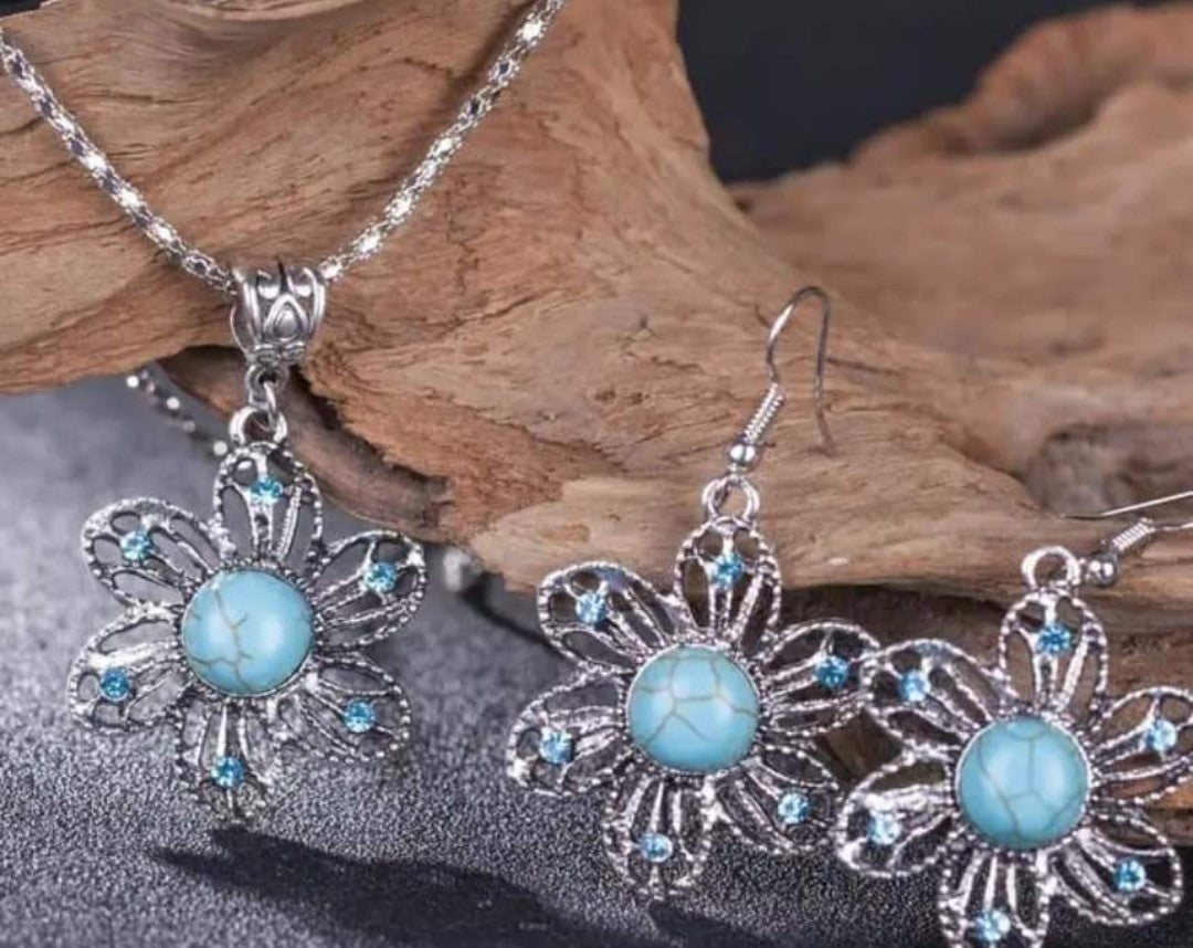 Silver & Blue Flower Necklace/Earring Set