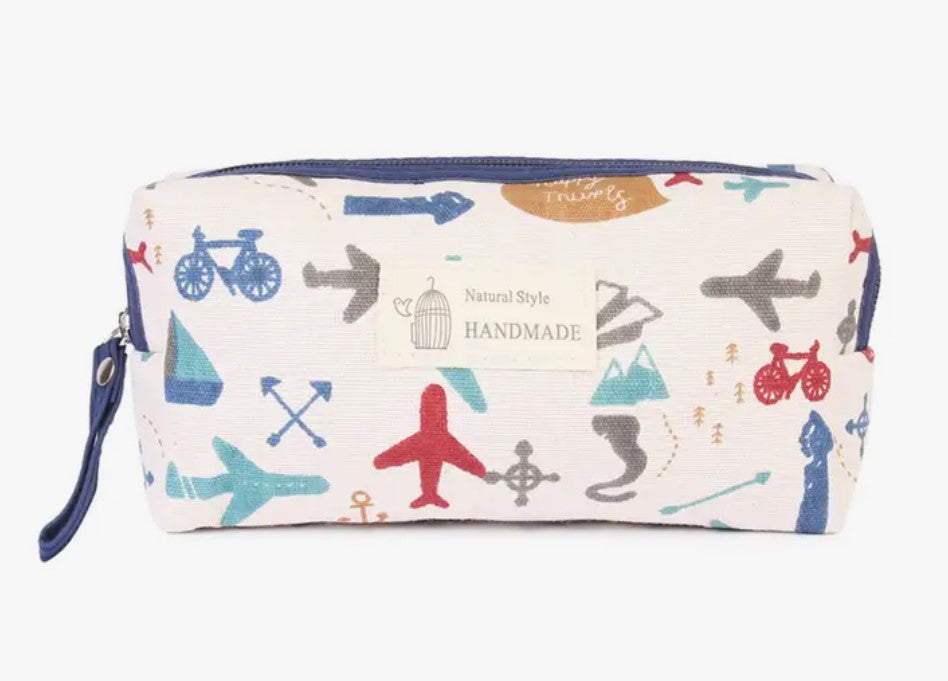 Stay organized while on the go with our Travel Print Cosmetic Pouch. Designed to hold your essential beauty and skincare products, this pouch features a stylish travel-inspired print that adds a touch of wanderlust to your accessories. The spacious interior and sturdy zipper closure ensure your items are secure and easily accessible.